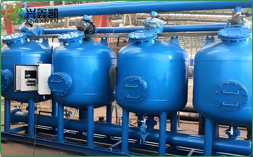 當系統處于過濾狀態時,加壓水從濾罐進口流入布水系統,均勻的到達濾料層。當水流過濾料層時,懸浮物被濾料截留。過濾器底部有帶縫隙的集水器,過濾后的干凈水被均勻收集,并流出過濾器。